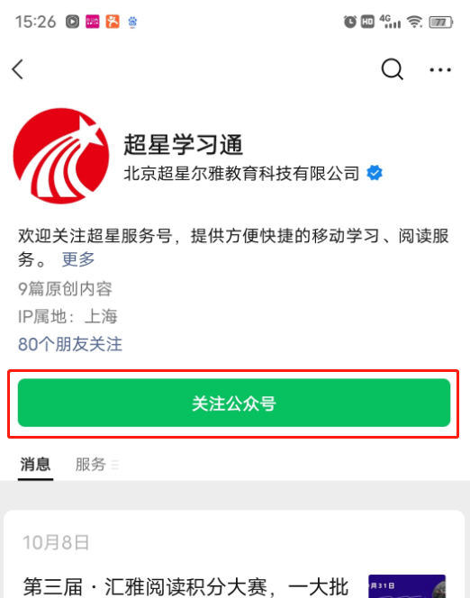 1、在微信中搜索“学习通”公众号,点����� �������Ƴ������������ �������Ƴ������������ �������Ƴ������������ �������Ƴ�������击“超星学习通”微信公众号并����� �������Ƴ������������ �������Ƴ������������ �������Ƴ������������ �������Ƴ�������进行关注。